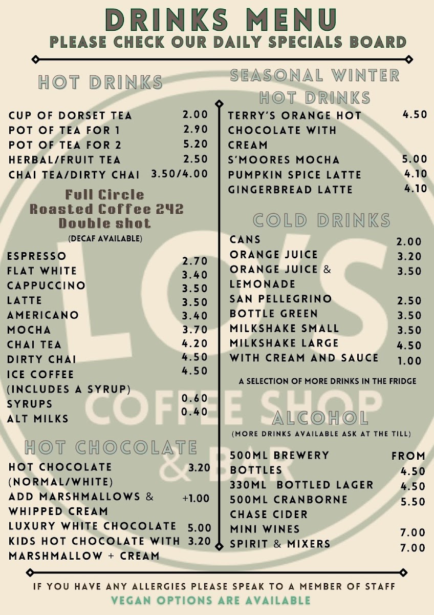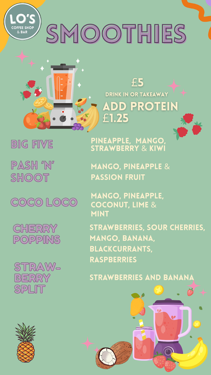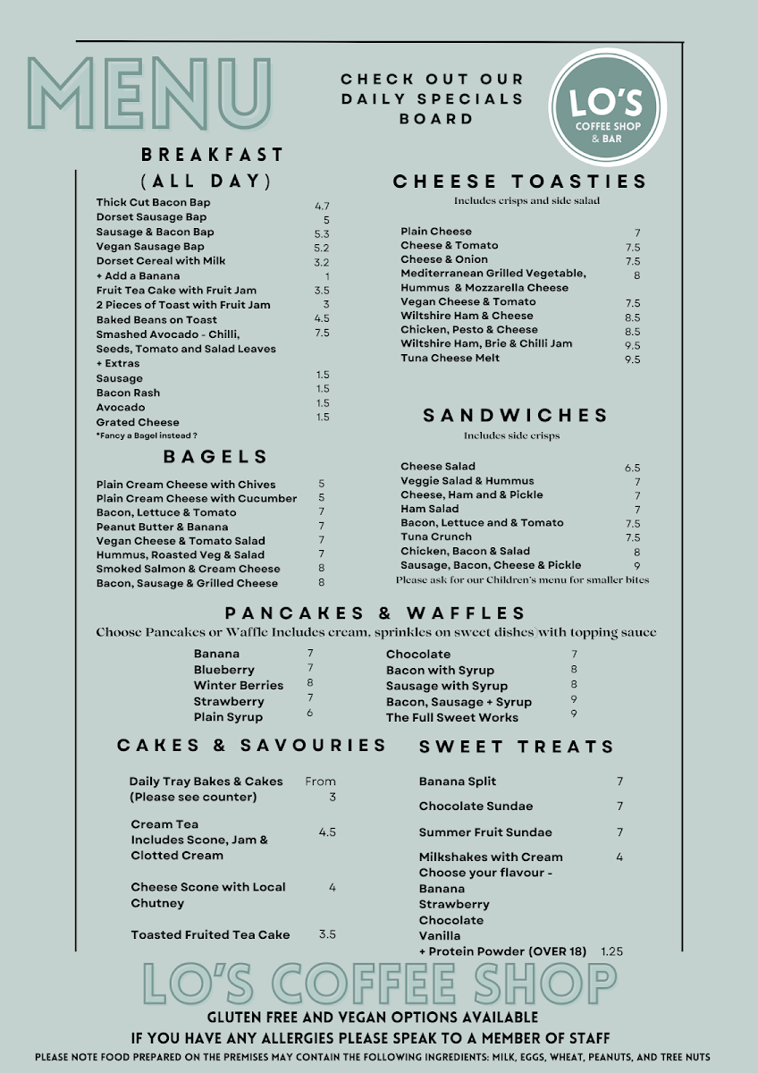 Lo’S Coffee Shop at R Lukins Fitness offers a diverse and enticing menu that caters to a wide range of tastes. For breakfast, you can indulge in a variety of baps, including the Thick Cut Bacon Bap and the Dorset Sausage Bap, with the option of a Vegan Sausage Bap for plant-based eaters. If you prefer a lighter start to the day, the Dorset Cereal With Milk is a great choice. Cheese lovers will enjoy a selection of Cheese Toasties, such as Plain Cheese, Cheese & Tomato, and Wiltshire Ham & Cheese, with vegan alternatives like Vegan Cheese & Tomato. Sandwich options include the classic Cheese Salad and Bacon, Lettuce & Tomato, while the bagels offer fillings like Plain Cream Cheese With Chives and Bacon, Lettuce & Tomato. For those with a sweet tooth, the Pancakes & Waffles come in delicious options like Chocolate, Banana, and Winter Berries. There are also daily Tray Bakes & Cakes, as well as a Cream Tea and a Cheese Scone With Local Chutney for a more savory treat. On the lighter side, the Chicken Summer Salad and Vegan Falafel Salad are fresh and satisfying options. The café also serves Smoothies like Big Five and Coco Loco, alongside a selection of indulgent desserts, including a Banana Split and Chocolate Sundae. The Christmas Menu features festive baps like the Christmas Feast Bap and Pigs In Blanket With Cheese Bap, perfect for the holiday season. Pair any of these with a hot drink, such as a Cappuccino or Americano, and enjoy a meal in this cozy setting. Whether you're after a hearty breakfast or a sweet treat, Lo’s Coffee Shop delivers a delightful menu for every preference.
